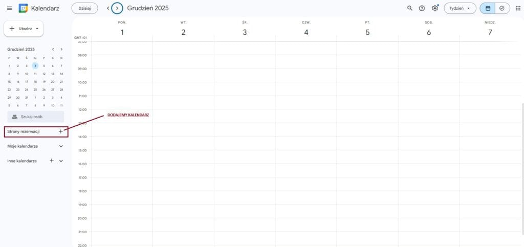 Z menu po lewej stronie wybieramy pozycję „Strony rezerwacji” i za pomocą „+” dodajemy kalendarz.