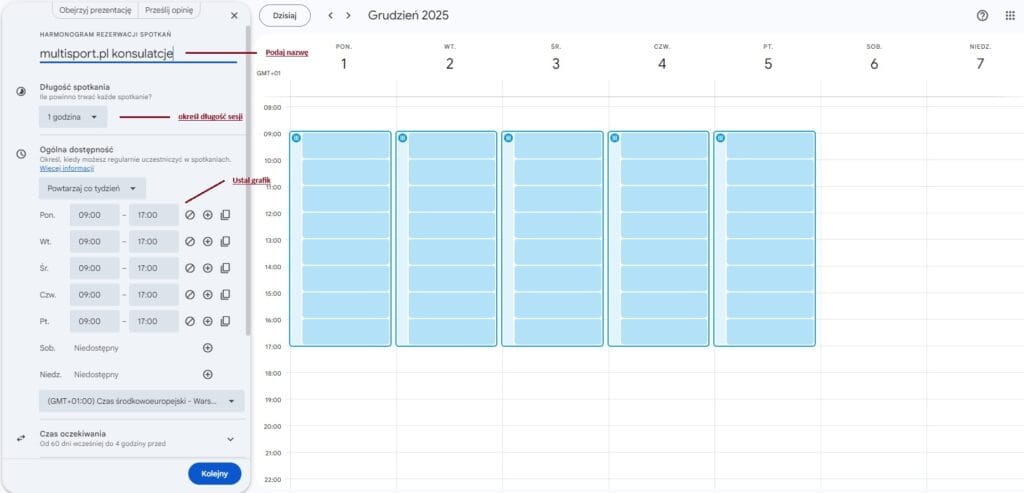 Na kolejnej karcie ustawiamy nazwę rezerwacji, określamy długość spotkań oraz godziny dostępności. Możemy też skonfigurować dodatkowe parametry takie jak czasokres rezerwacji spotkań, przerwy pomiędzy spotkaniami, integracje z kalendarzem prywatnym i wiele innych.