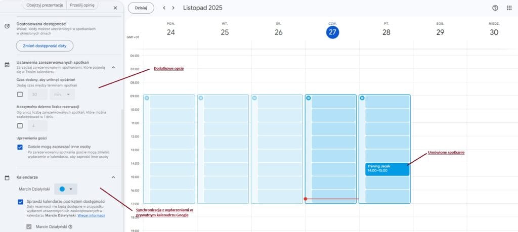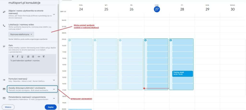 Kolejny krok to personalizacja wyświetlania i szczegółów terminarza. W płatnej wersji Google Workspace Premium można określić sposób dokonywania płatności za rezerwację. Na dzień 02.12.2025r. cena wynosi ok 75,00 zł miesięcznie.