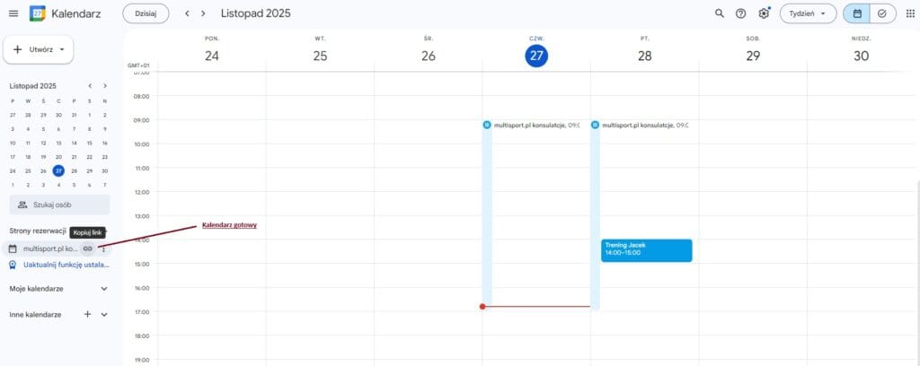 Na głównej stronie calendar.google.com w menu po lewej w zakładce „strony rezerwacji” pojawił się ustawiony terminarz. Po wybraniu ikony łańcuszka kopiujemy link do terminarza i możemy się nim w pełni posługiwać.
