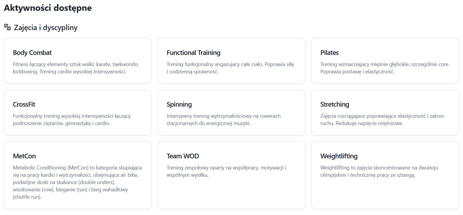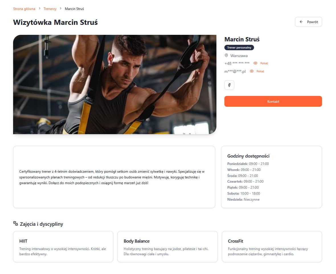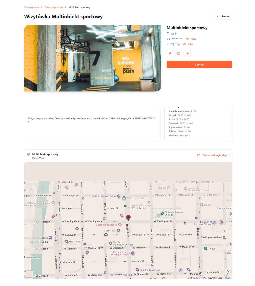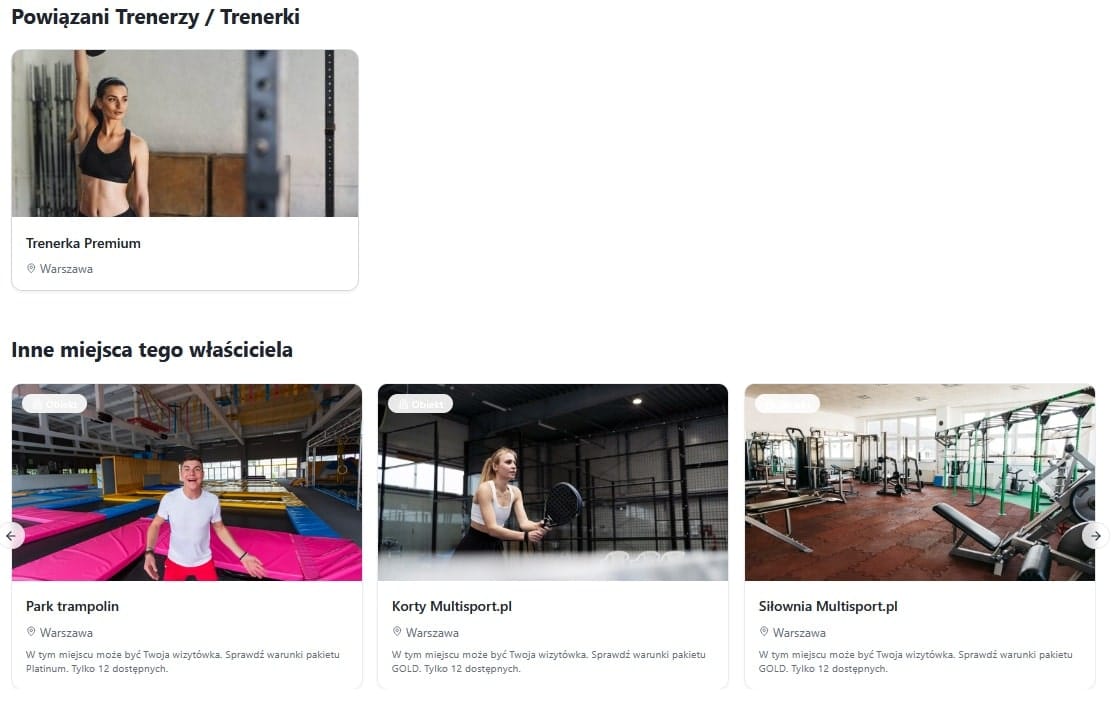 Wygląd wizytówki dla poszczególnych kategorii: obiekty, trenerzy, zajęcia i sklepy różni się detalami – np. zawiera mapę i fizyczny adres.