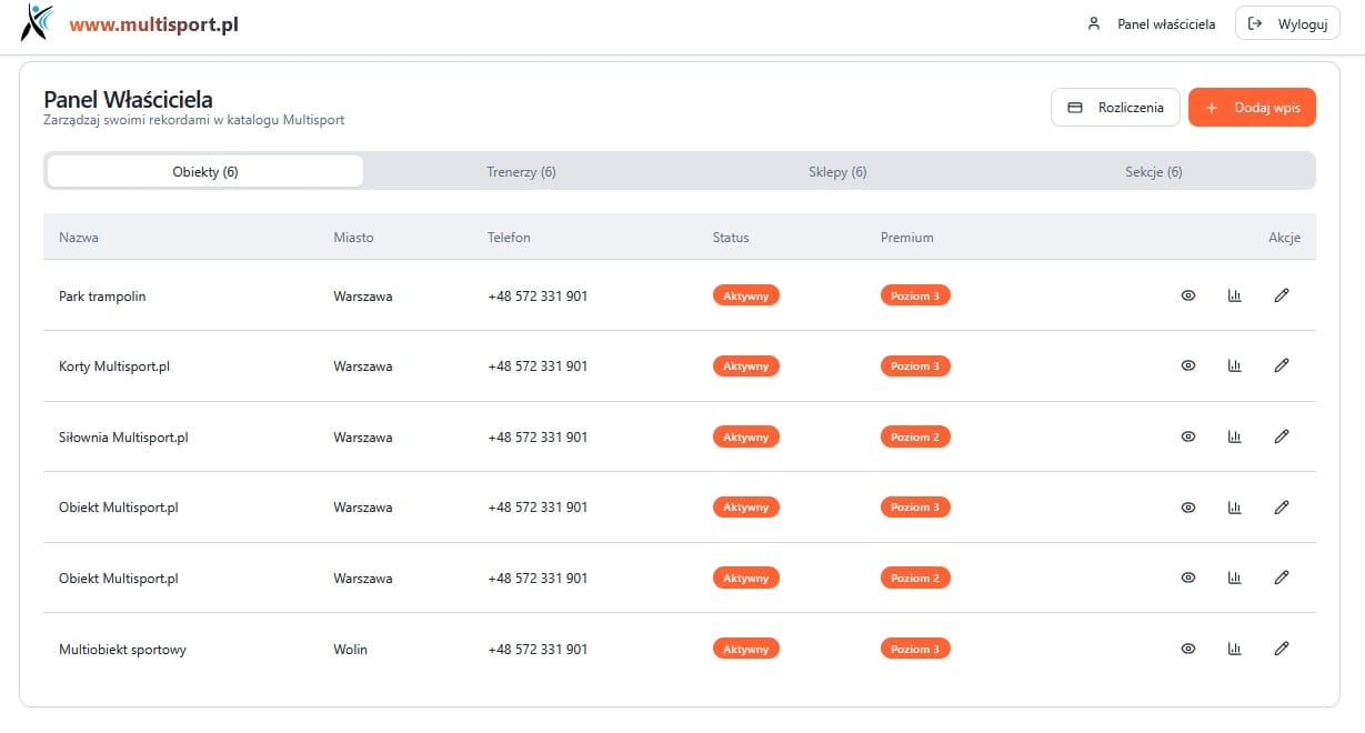 Po zalogowaniu każdy użytkownik widzi kartę panelu właściciela, na której może dodawać nowe wizytówki oraz zarządzać posiadanymi wpisami.
