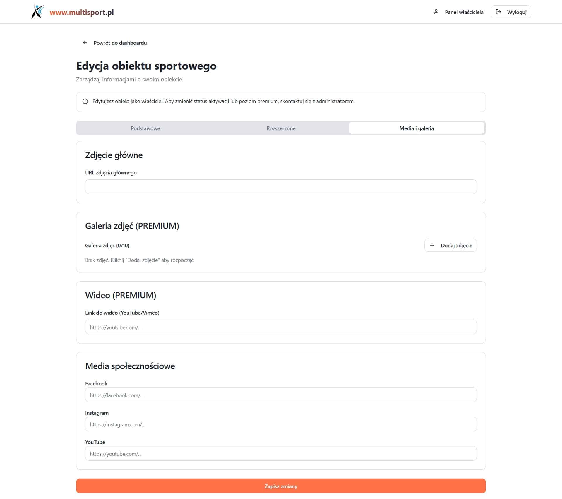 Po uzupełnieniu podstawowych danych i ich zapisaniu otwarta zostanie właściwa karta wizytówki z podziałem na trzy zakładki: Podstawowe, Rozszerzone oraz Media i galeria.