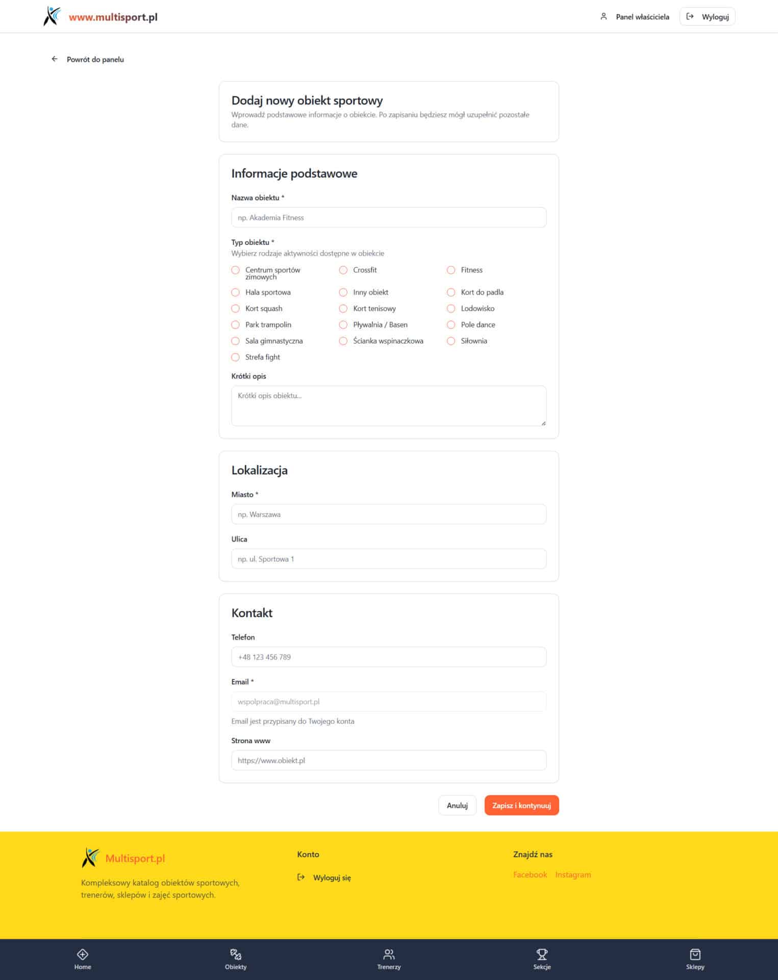 Aby dodać nową wizytówkę należy kliknąć przycisk w prawej górnej części ekranu „+Dodaj wpis”, a następnie wybrać kategorię spośród czterech dostępnych: Obiekty, Trenerzy, Sklepy oraz Sekcje.